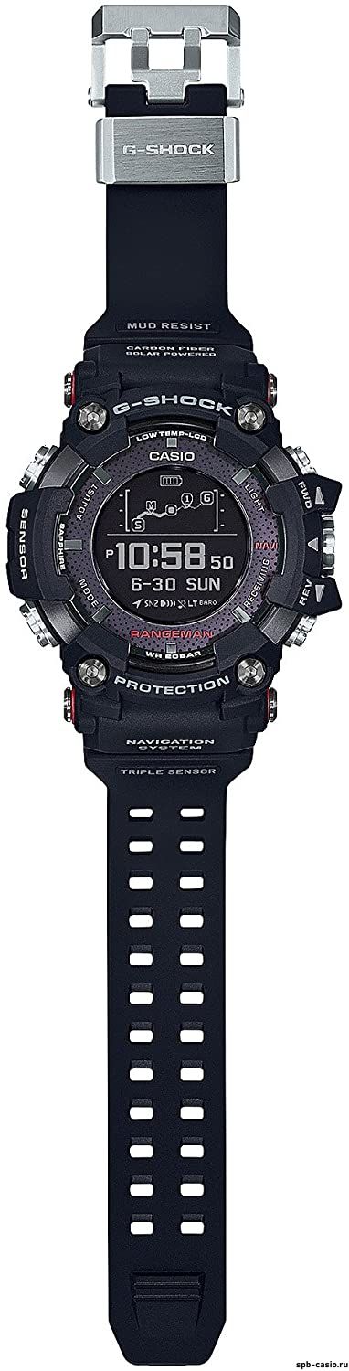 Перед вами большой релиз 2018 года из профессиональной серии G-SHOCK RANGEMAN на полимерном ремешке с карбоновыми вставками! Помимо великолепного брутального дизайна в массивном черном корпусе вы найдете Triple Sensor: термометр, барометр/высотомер, компас, встроенный GPS-модуль, позволяющий записывать данные трека или отображать преодоленный маршрут в реальном времени прямо на дисплее часов, а также отображение восхода и заката Солнца.