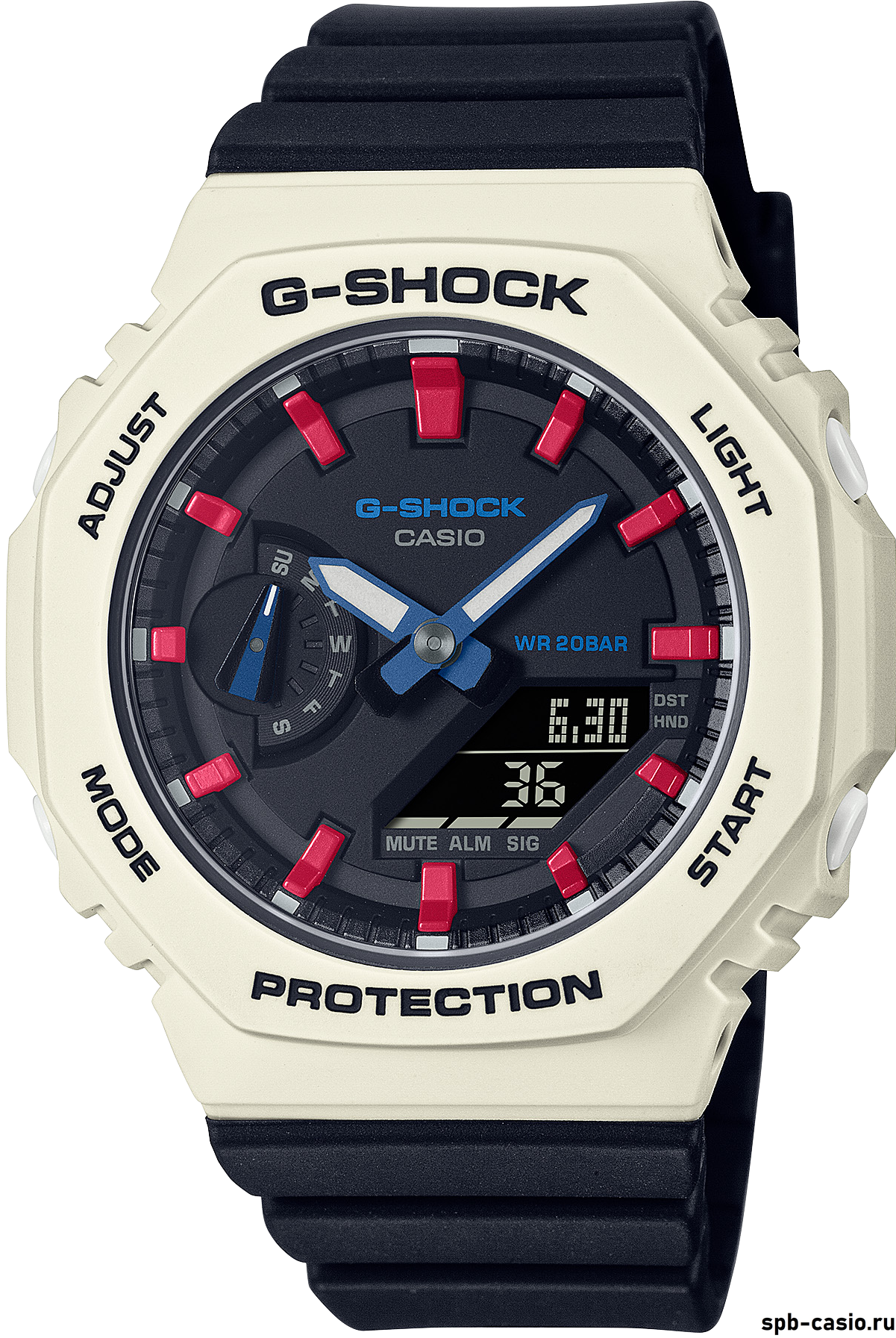 Часы обладают технологией Carbon Core Guard: их модуль защищает легкий и сверх-прочный полиуретановый корпус с углеродным армированием, а циферблат покрыт закаленным минеральным стеклом. Конечно же, не стоит забывать про стандартную для джишоков ударопрочность и водозащиту в 200 метров, функции секундомера, таймера, мирового времени, удобную функцию складывания стрелок для считывания информации с дисплеев, а также яркую двойную подсветку циферблата и дисплея.