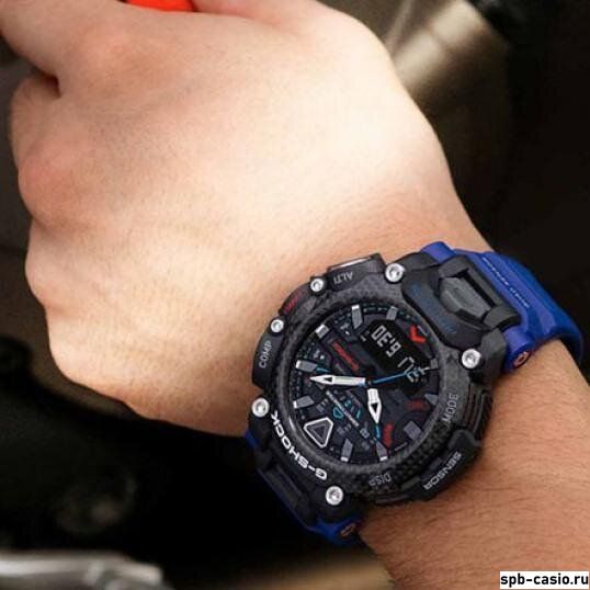 Перед вами большой релиз Casio 2020 года — сверхпрочная многофункциональная модель G-SHOCK GR-B200 из серии GRAVITYMASTER в черном корпусе на ярком синем полимерном ремешке. Новый массивный корпус часов выполнен из карбона, а карбоновый безель дополнительно покрыт слоем прозрачного полимера, защищающего его от повреждений.
