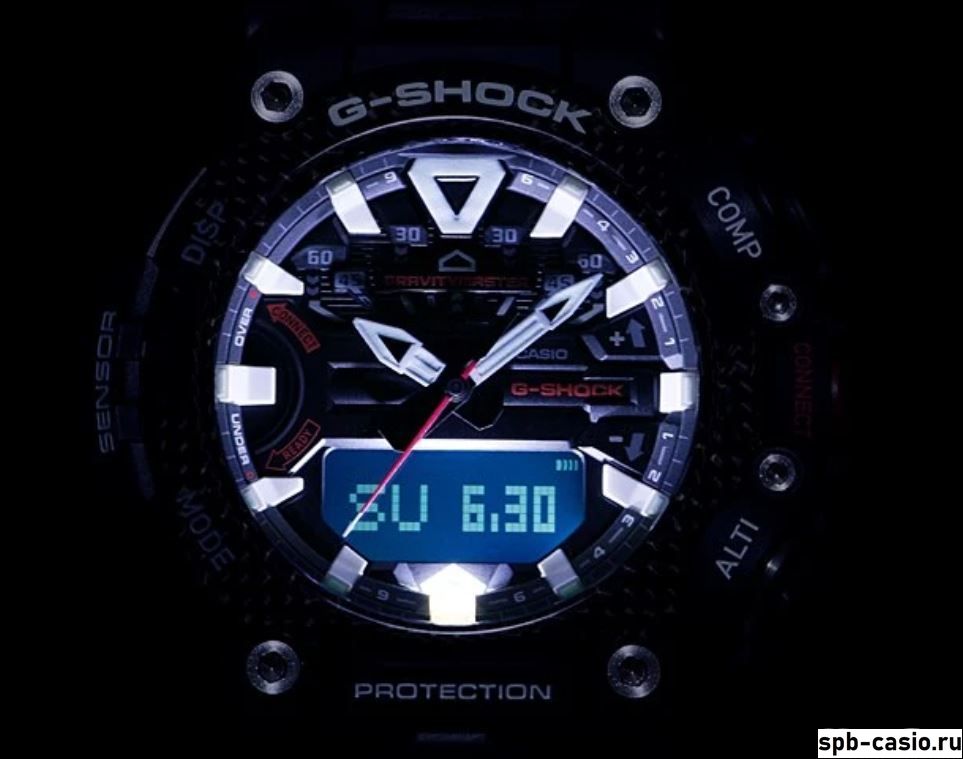 Отметим также улучшенную технологию защиты механизма от перегрузок и вибраций, легендарную джишоковую ударопрочность, водозащиту до 200 метров, сверхмощную подсветку циферблата, дисплея и необрайт стрелок.