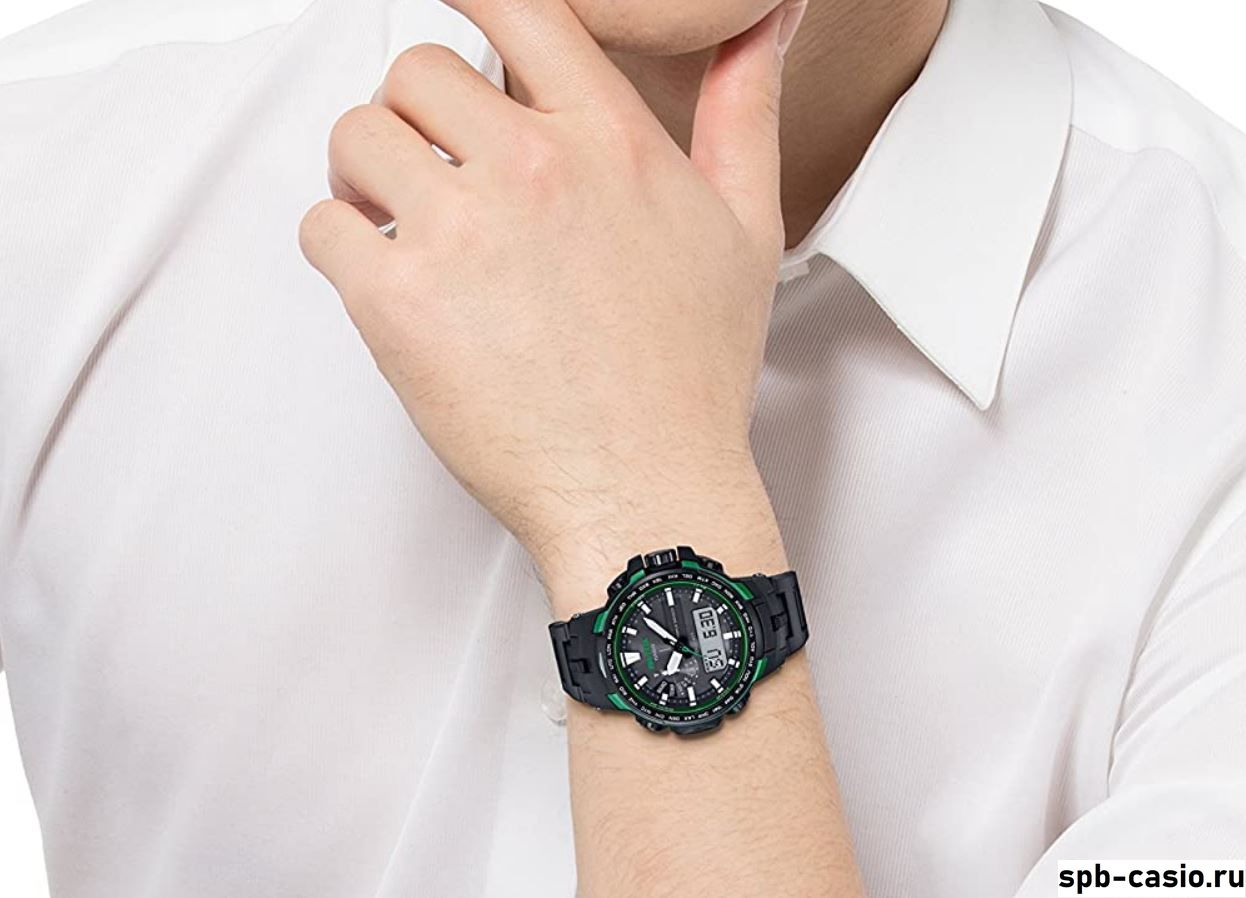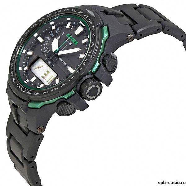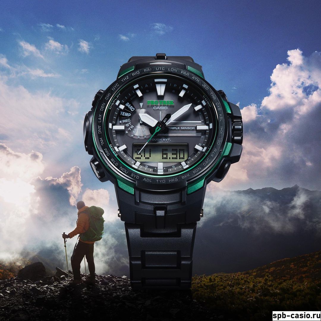 Перед вами флагманы PRO TREK с аналого-цифровым дисплеем и зелеными деталями из серии PRW-6100 Новый корпус толщиной всего 12.8 мм содержит в себе: термометр, барометр, высотомер и цифровой компас, солнечную батарею, радио-синхронизацию времени с атомными часами. Также модель оснащена системой SMART ACCESS, обеспечивающей быстрый и интуитивно понятный доступ ко всем важным функциям часов с помощью электронной заводной головки.