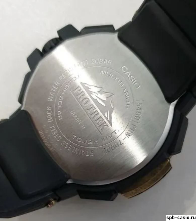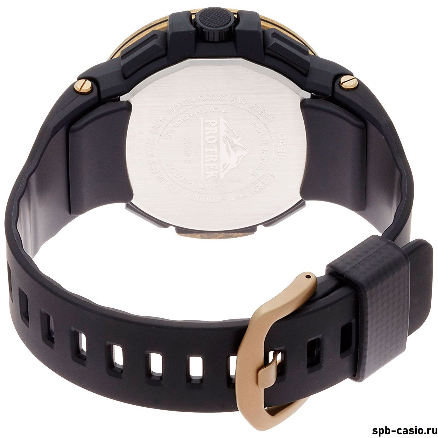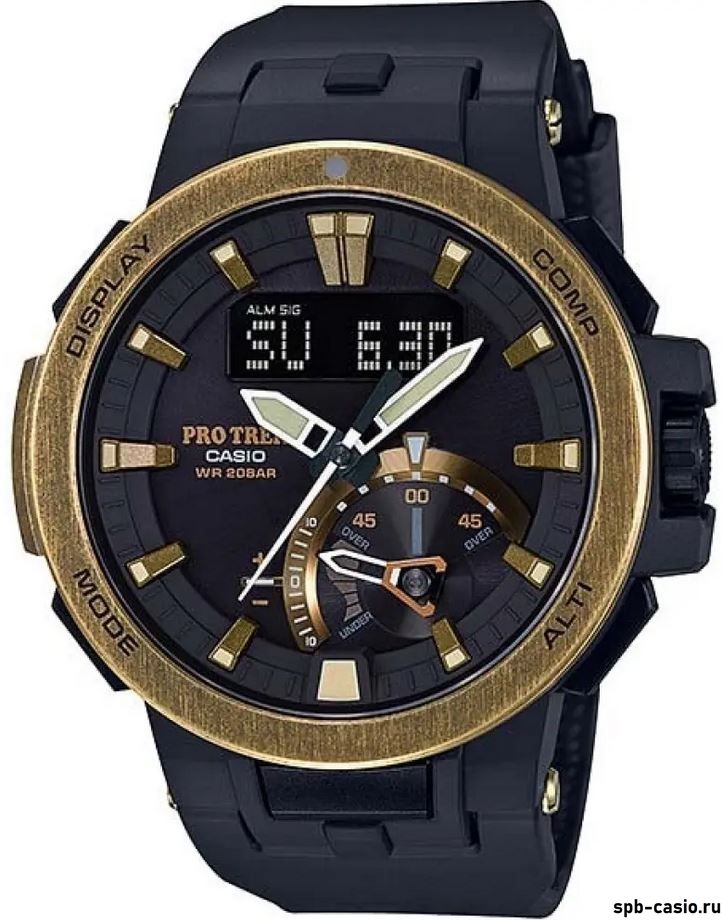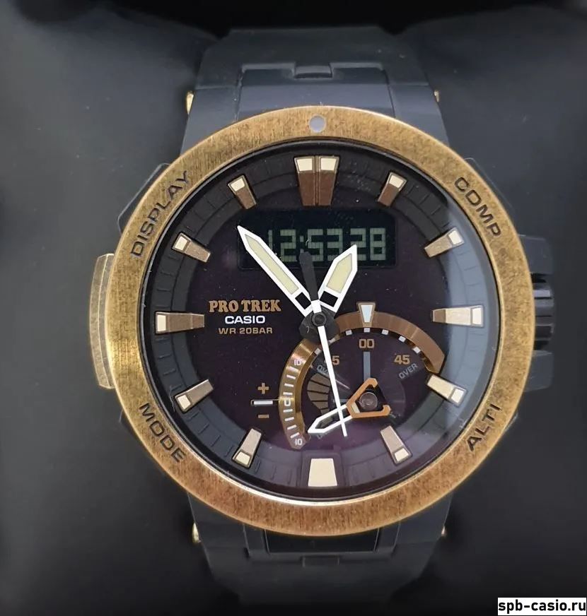 Перед вами лимитированная модель PRO TREK 2019 года из серии PRW-7000 в черном корпусе с деталями цвета розового золота и карбоновым безелем вокруг аналого-цифрового циферблата.