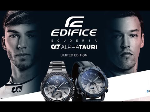 коллаборация второй половины 2020 года в коллекции Edifice и итальянской гоночной команды Формулы-1 Scuderia AlphaTauri из свежей серии ECB-20 в стальном корпусе с ионизированным покрытием цвета Blue Navy и синим ремешком из натуральной кожи с тисненым названием итальянской формульной конюшни.