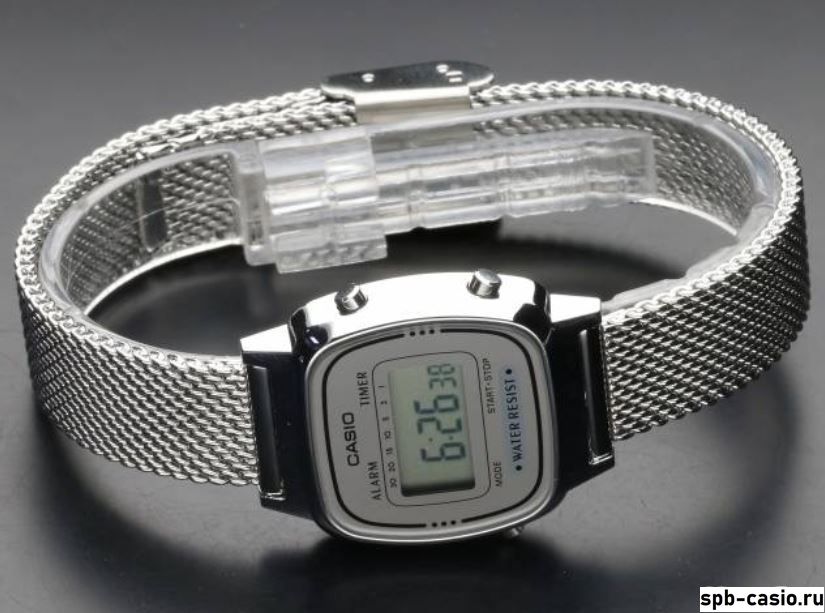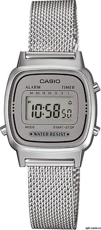Способ отображения временицифровой (электронный)Цвет корпусаСеребряныйЦвет браслета/ремешкаСеребряныйЦвет циферблатаСерыйФормапрямоугольникМатериал корпусапластикМатериал браслета/ремешканерж. стальКласс водонепроницаемостиWR30 (3 атм) - брызги, дождьЦифрыарабскиеСтеклоакриловоеИсточник энергииБатарея 2 годаОтображение числаестьСекундомерестьТаймер обратного отсчетаестьБудильникестьДиаметр корпуса30 мм