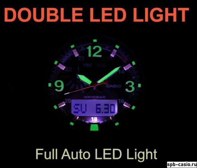 Для того, чтобы Вы еще имели возможность с легкостью считать показания часов даже в полной темноте, аналоговый циферблат часов и цифровой дисплей подсвечиваются светодиодом при нажатии на эту кнопку.